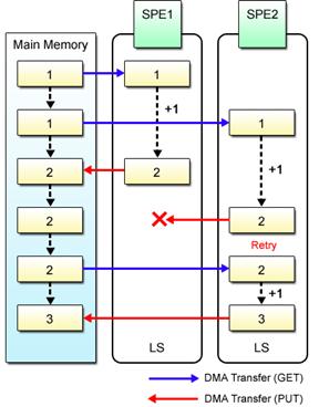 While DMA transfer allows transfer of up to 16K bytes of data between the main memory and each SPE’s LS, mailboxes are designed for transfer of 32-bit data between the PPE and the SPE.
